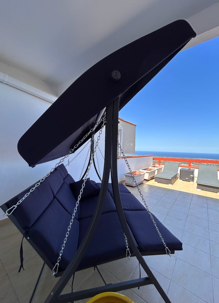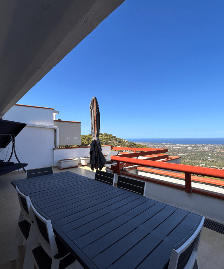Un grande living luminoso con divano letto e ampie vetrate si apre sull’enorme terrazzo panoramico, da cui si ammira l’intera valle fino al mare.